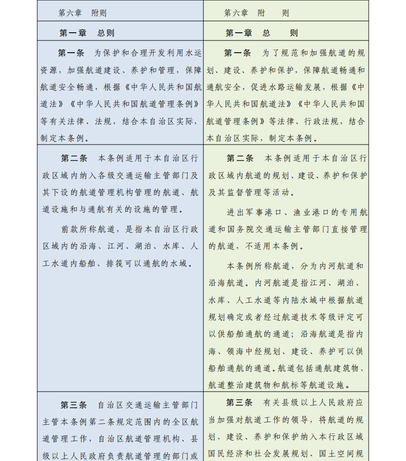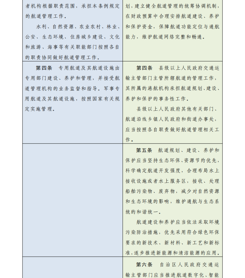 一是明确适用范围为本自治区行政区域内航道的规划、建设、养护和保护及其监督管理等活动,进出军事港口、渔业港口的专用航道和国务院交通运输主管部门直接管理的航道除外(第二条第一款、第二款)。二是按照机构改革要求,结合我区实际,明确县级以上人民政府交通运输主管部门主管所辖航道的管理工作,其所属的港航机构承担航道规划、建设、养护和保护的事务性工作(第四条第一款)。三是规定绿色航道和智慧航道建设(第五条、第六条)。