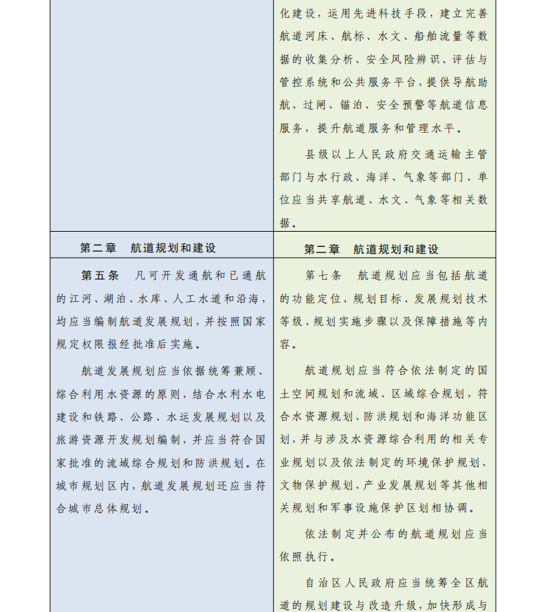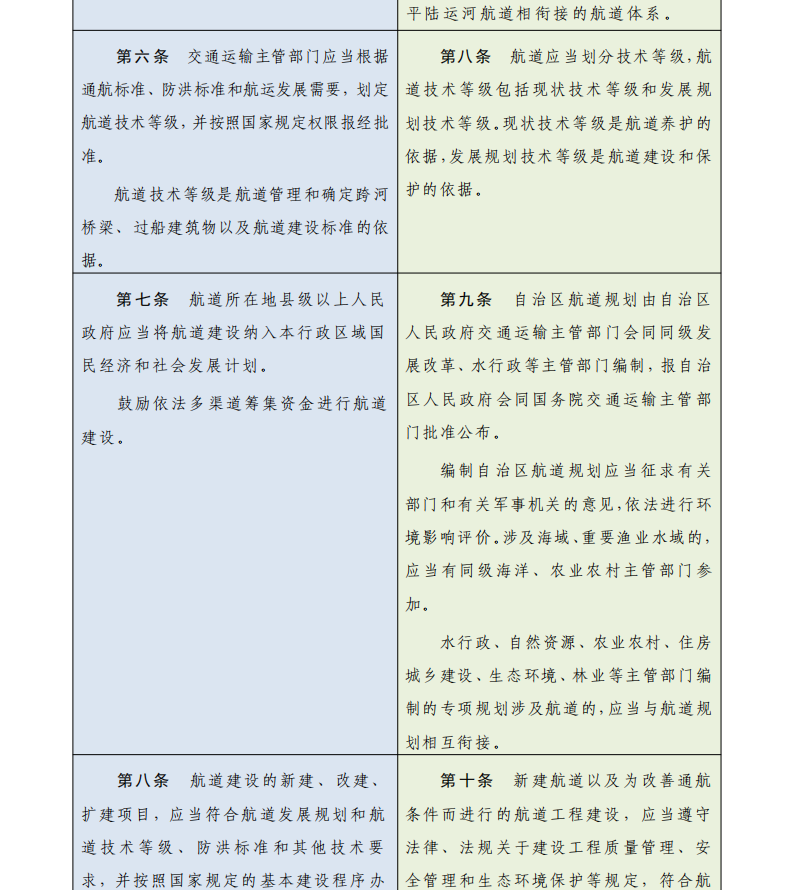 此次修订后的《条例》共六章36条,包括总则、航道规划和建设、航道养护、航道保护、法律责任、附则等内容。