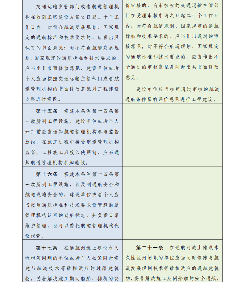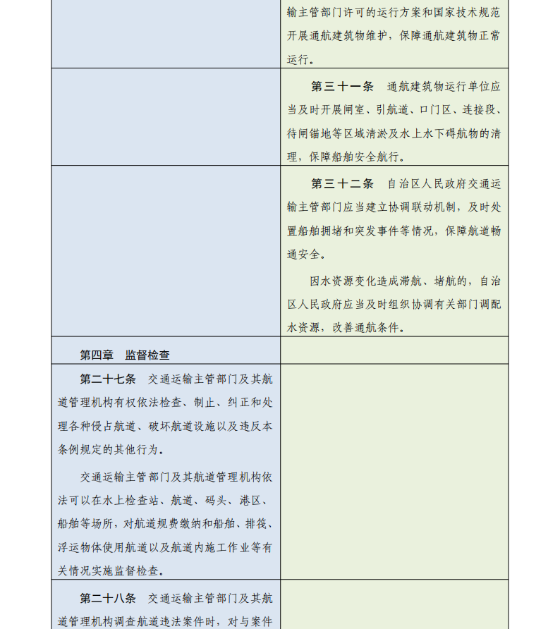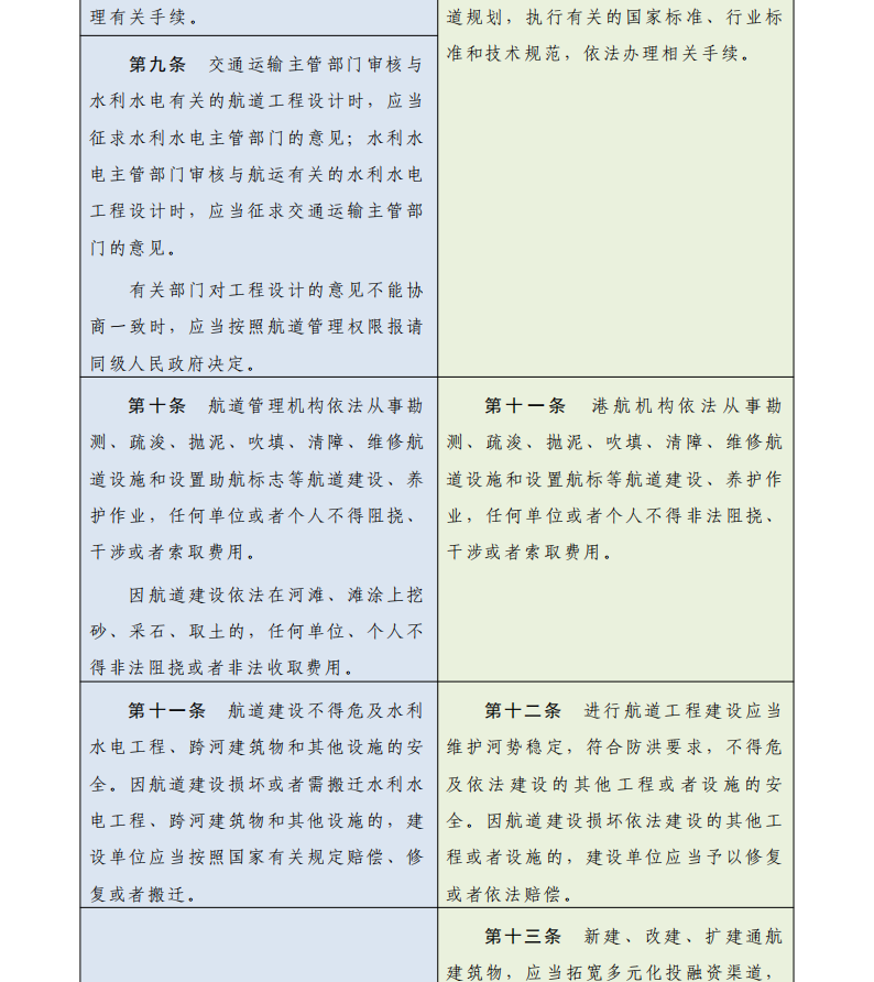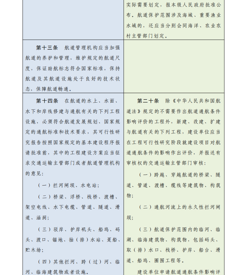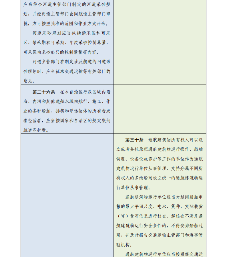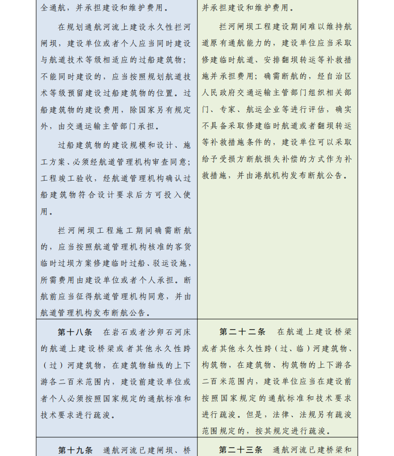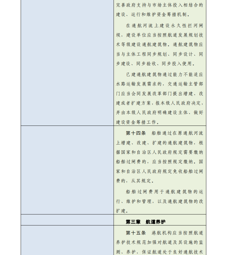 一是明确航道保护范围的划定主体和程序(第十九条第二款)。二是明确需作出航道通航条件影响评价的工程范围和审核程序,规定建设单位应当按照通过审核的航道通航条件影响评价意见进行工程建设(第二十条)。三是结合我区实际,明确拦河闸坝工程建设期间难以维持航道原有通航能力且确需断航的,经自治区人民政府交通运输主管部门组织相关部门、专家、航运企业等进行评估,确实不具备采取修建临时航道或者翻坝转运等补救措施条件的,建设单位可以采取给予受损方断航损失补偿的方式作为补救措施(第二十一条第二款)。四是明确保护范围禁止性行为和危害航道通航安全禁止性行为(第二十七条、第二十八条)。五是明确通航建筑物所有权人可以设立或者委托承担通航建筑物运行操作、船舶调度、设备设施养护等工作的单位作为通航建筑物运行单位从事管理。支持分属不同所有权人的多线船闸设立统一的通航建筑物运行单位从事管理(第三十条第一款)。六是明确自治区人民政府交通运输主管部门应当建立协调联动机制,及时处置船舶拥堵和突发事件等情况,保障航道畅通安全(第三十二条第一款)。