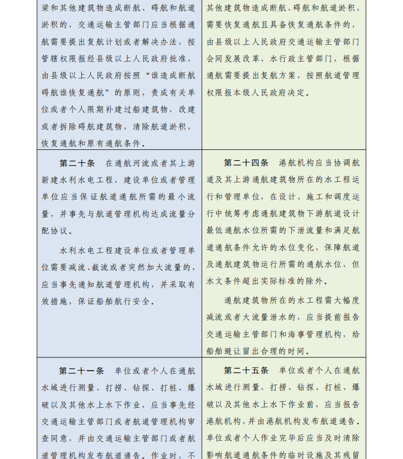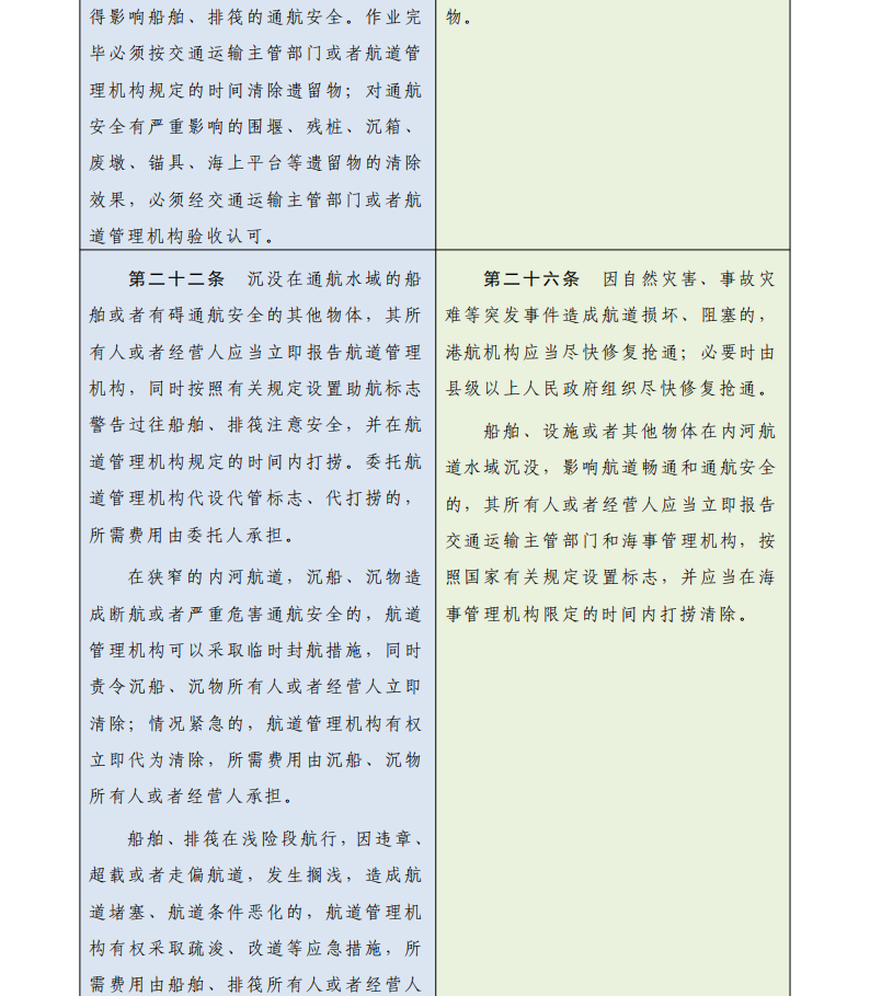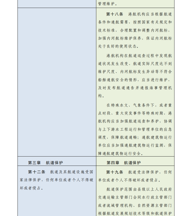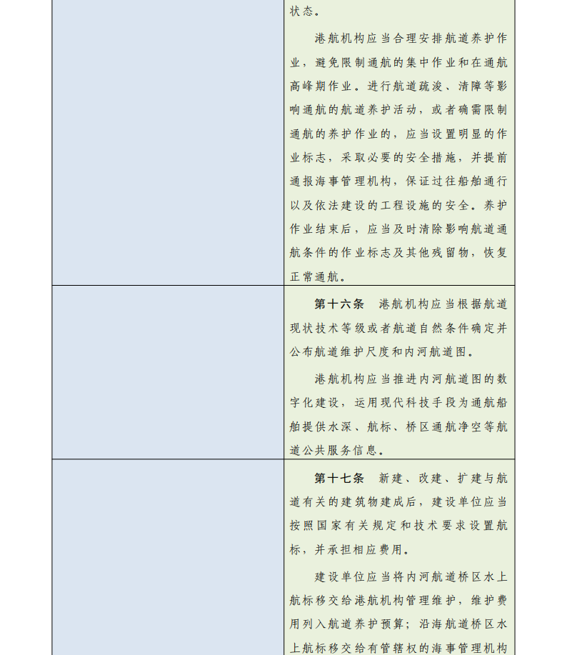 一是明确港航机构应当按照航道养护技术规范加强对航道及其设施的监测、养护,保证航道处于良好通航技术状态(第十五条第一款)。二是明确港航机构应当推进内河航道图的数字化建设,运用现代科技手段为通航船舶提供水深、航标、桥区通航净空等航道公共服务信息(第十六条第二款)。三是明确新建、改建、扩建与航道有关的建筑物建成后,建设单位应当按照国家有关规定和技术要求设置航标,航标应按内河和沿海区域不同分别移交给港航机构和海事管理机构管理维护(第十七条)。四是规定在特殊水文、气象条件下,或者重点时段、重大突发事件等特殊时期,港航机构应当加强航道巡查和养护,协调与上下游水工程运行和管理单位的应急调度,保障航道通畅;通航建筑物运行单位应当加强通航建筑物运行监测,保障通航建筑物运行安全(第十八条第三款)。
