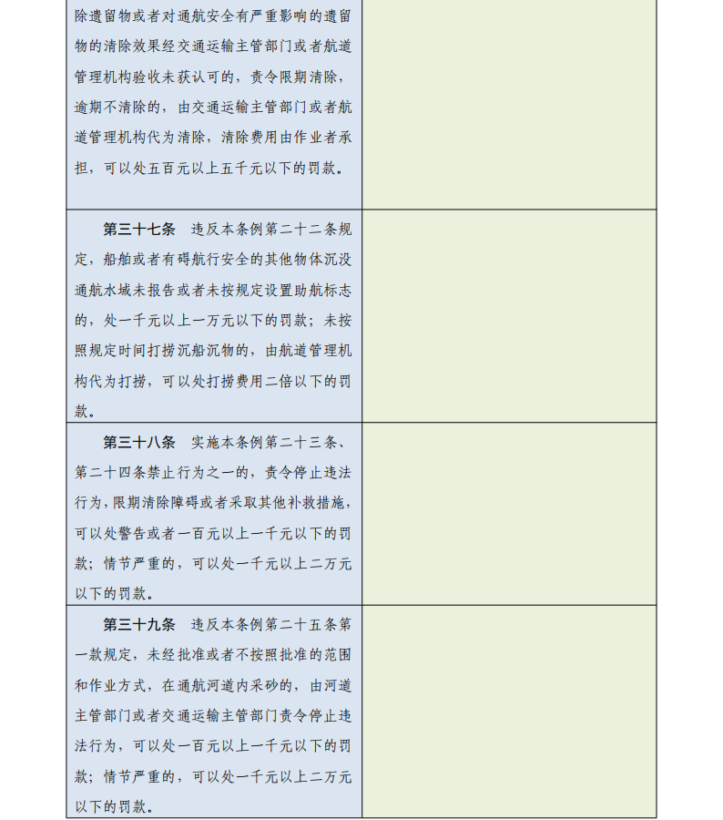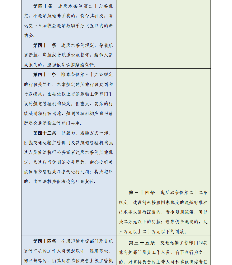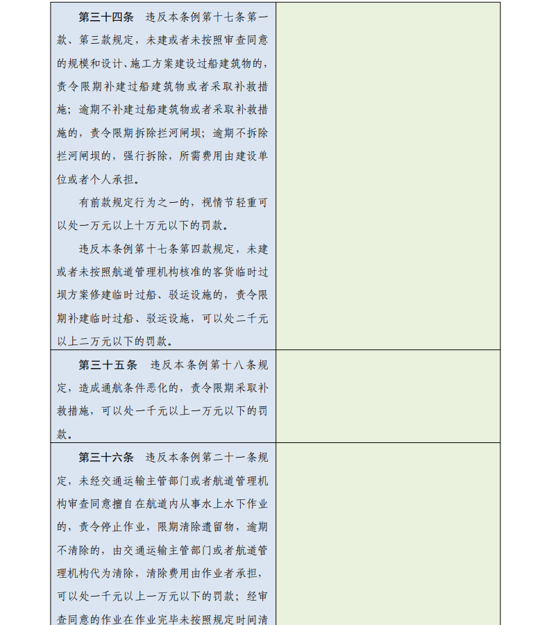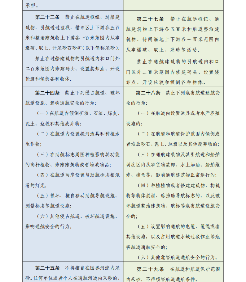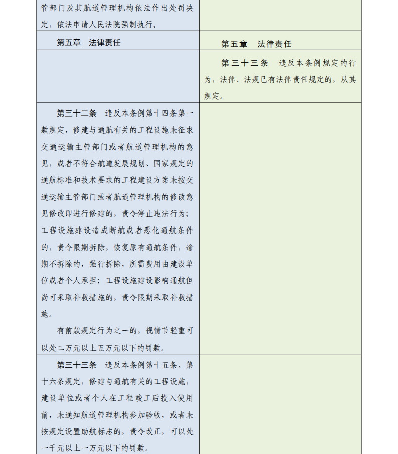 对已有法律、法规规定的法律责任予以删除并明确从其规定。明确在航道上建设桥梁或者其他永久性跨(过、临)河建筑物、构筑物,在建筑物、构筑物的上下游各二百米范围内的,建设单位在建设前未按照国家规定的通航标准和技术要求进行疏浚的法律责任(第三十四条)。
