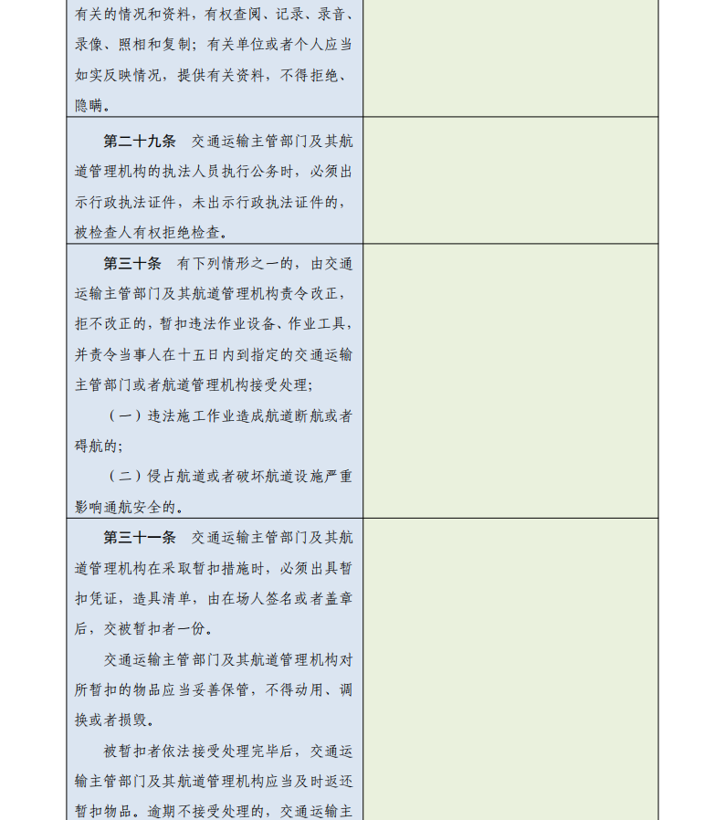 此外,考虑到《中华人民共和国行政处罚法》和交通运输部《交通运输行政执法程序规定》已对航道执法程序作出了全面规定,现行条例设置的行政强制措施与《中华人民共和国行政强制法》的规定不一致,条例删除了现行条例第四章监督检查内容。