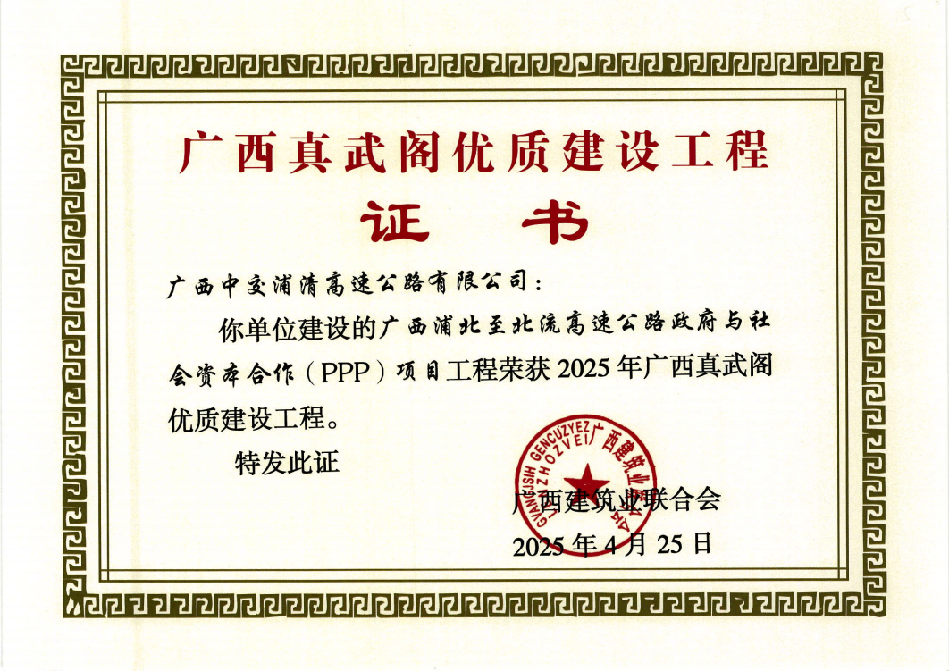 卓越的建设成果赢得了行业内外的广泛认可。截至目前,浦清高速项目已斩获多项荣誉:科技进步奖4项、省部级工法6项、QC成果12项、BIM奖3项、专利63项;荣获广西壮族自治区建设工程优质结构奖9项、建筑业绿色施工示范工程7项,中国交建优质混凝土奖2项,玉林市“万花楼杯”奖9项;还获评广西真武阁优质工程奖、玉林市安全文明标准化工地,两次荣获自治区平安工地称号,并入选2021年自治区平安工地建设典型示范项目。