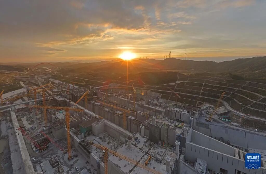 沿航道一路向南,忽见一道大坝将水拦腰截断。不远处,塔吊林立、焊花飞溅,一座巨型结构物巍然耸立。