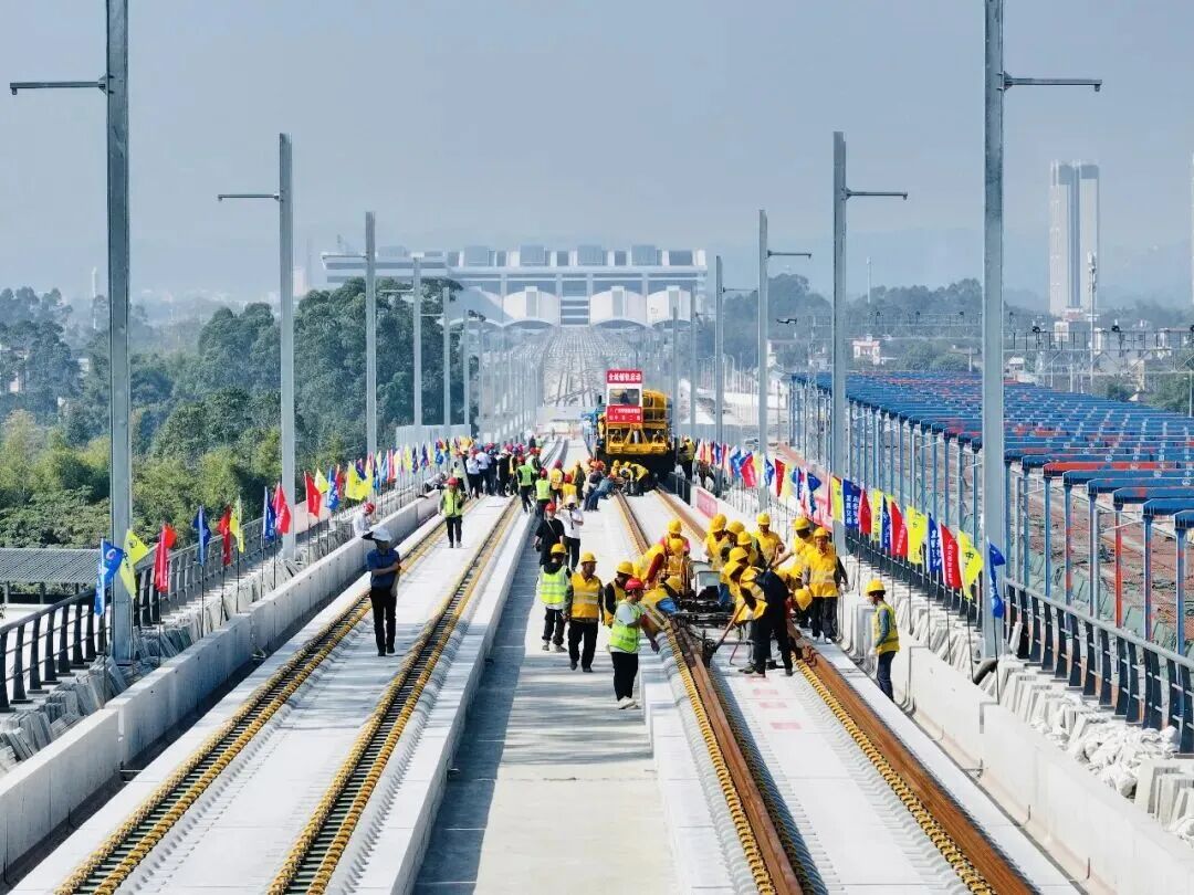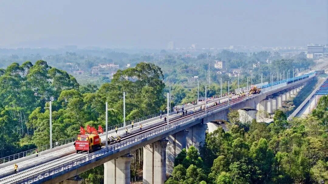就在广湛高铁通车前两天,12月20日,在广西北流市境内的南珠高铁玉林北至岑溪东段铺轨施工现场,首对500米长钢轨平稳铺设在无砟道床板上,标志着该段高铁进入全线铺轨阶段。